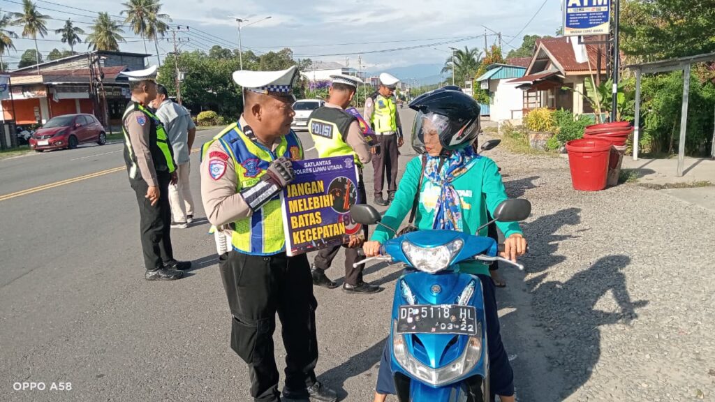 LUWU UTARA – Memasuki hari ke-6 pelaksanaan Operasi Keselamatan Pallawa 2026, Satlantas Polres Luwu Utara terus menggencarkan kampanye tertib berlalu lintas melalui pendekatan edukatif dan humanis. Personel Satgas 1 Preemtif turun langsung ke Jalan Nasional, Kelurahan Kappuna, Kecamatan Masamba, untuk menyapa dan mengedukasi para pengguna jalan.