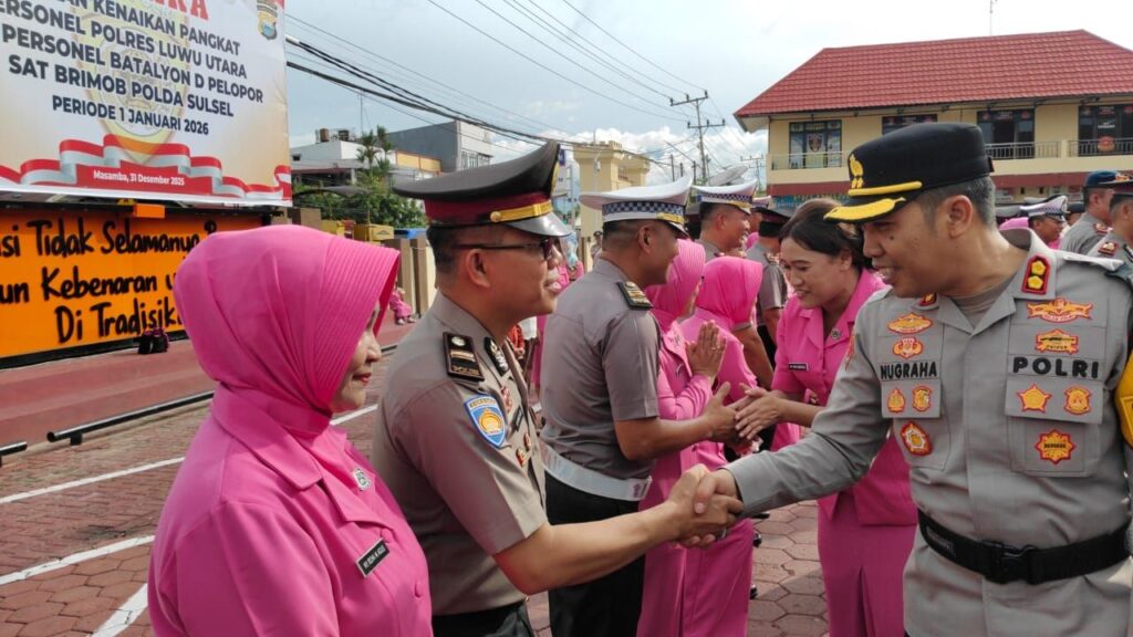 Southsulawesinews25.com.Luwu Utara — Kapolres Luwu Utara AKBP Nugraha Pamungkas S.IK, M.H, pimpin upacara laporan kenaikan pangkat Personel Polres Luwu Utara dan Batalyon D Pelopor Sat Brimob Polda Sulsel, di Lapangan Apel Mapolres Luwu Utara Kelurahan Kappuna, Kecamatan Masamba, Rabu (31/12/2025).