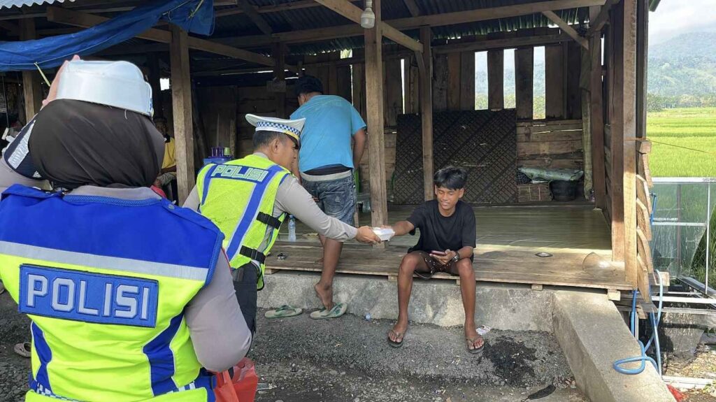 Kegiatan tersebut dipimpin oleh IPDA Iqbal Wirawan Kasim, S.Sos., M.Si., bersama Brigpol Wahyuni, Briptu Afda, dan Bripda Gusti. Selain berbagi makanan, personel juga melakukan pengaturan lalu lintas serta pengamanan untuk memastikan situasi tetap aman, tertib, dan kondusif.