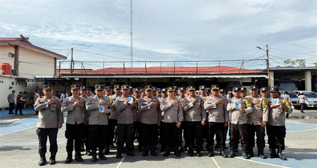 Kapolres Palopo AKBP Dedi Surya Dharma SH., SIK., MM, usai memimpin apel Pagi menyerahkan secara simbolis kepada para Bhabinkamtibmas Polres Palopo Stiker Aplikasi LAPOR KAMTIBMAS “Mabbulo Sibatang” untuk disebarkan ke masyarakat sebagai bentuk perluasan informasi layanan kepolisian. Rabu (12/11/2025).