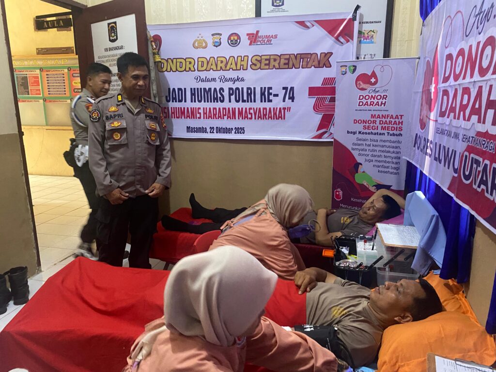Luwu Utara — Dalam rangka memperingati Hari Jadi Humas Polri ke-74 tahun 2025, Polres Luwu Utara menggelar kegiatan donor darah serentak yang dilaksanakan di Polsek Baebunta, Desa Salulemo, Kecamatan Baebunta, Kabupaten Luwu Utara, Rabu (22/10/2025).